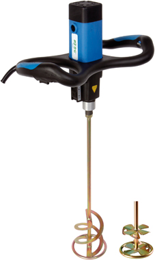 Electric multi-purpose mixer for materials with low and high viscosity. 1.300 Watt, 230 V, stageless adjustable. Delivered including mortar stirrer and disc stirrer.