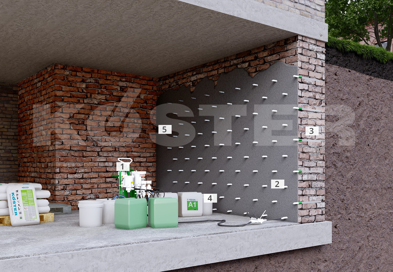 KÖSTER Injection Gel G4 is injected in multiple phases until a pressure resistance is achieved. Afterwards the packer holes are filled with KÖSTER KB-Fix 5. For a decorative and functional surface design, KÖSTER Restoration Plasters can be applied over the KÖSTER Injection Barrier.