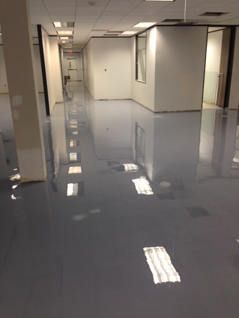 The 17,000 sf electronics manufacturing facility was being completely renovated. The 35 year old slab had issues with moisture vapor emissions. After the flooring and adhesive was removed, the concrete was grinded first, then shot blasted to a CSP of 3-4. KOSTER VAP and TA thickening agent was used to fill in cracks and dormant joints. KOSTER VAP1 2000 ZERO was used to coat the floor afterward. The Floor was then coated with two coats of MPE Squirrel Grey and was topcoated with a urethane topcoat.