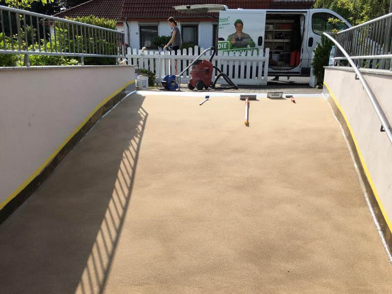 Eine Rampe für eine Garage hatte diverse Risse und Lunker. Die Risse wurden vernadelt und anschließend eine Spachtelung und Grundierung aufgebracht. Im Anschluss wurde die Fläche versiegelt.