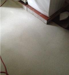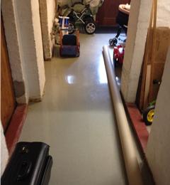 Der Fußbodenbelag (PVC) hatte sich durch Feuchtigkeit abgelöst. Maßnahme: Altbelag entfernt, Oberflächenvorbereitung, Grundierung mit KÖSTER VAP I 2000 gegen aufsteigende Feuchtigkeit, Kratzspachtelung mit KÖSTER LF-BM, Beschichtung mit KÖSTER LF-VL und loser Chipeinstreuung.